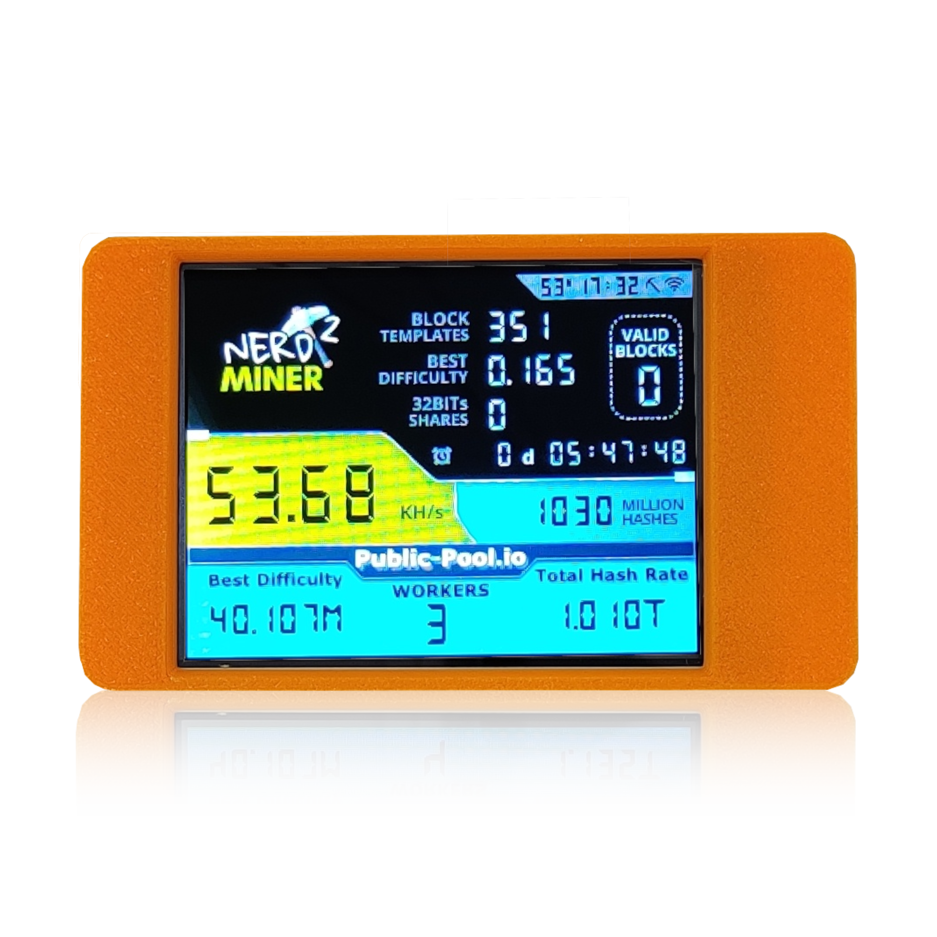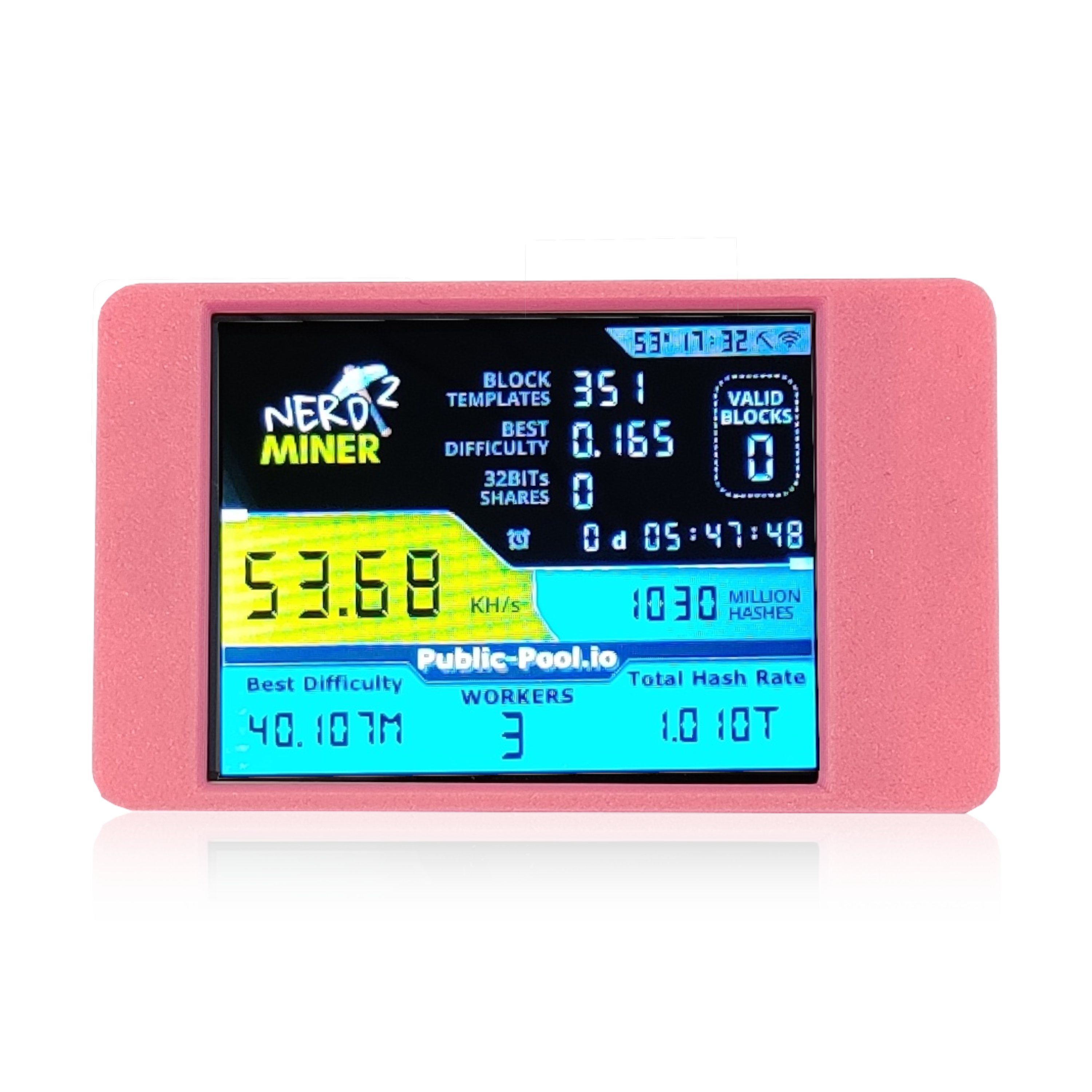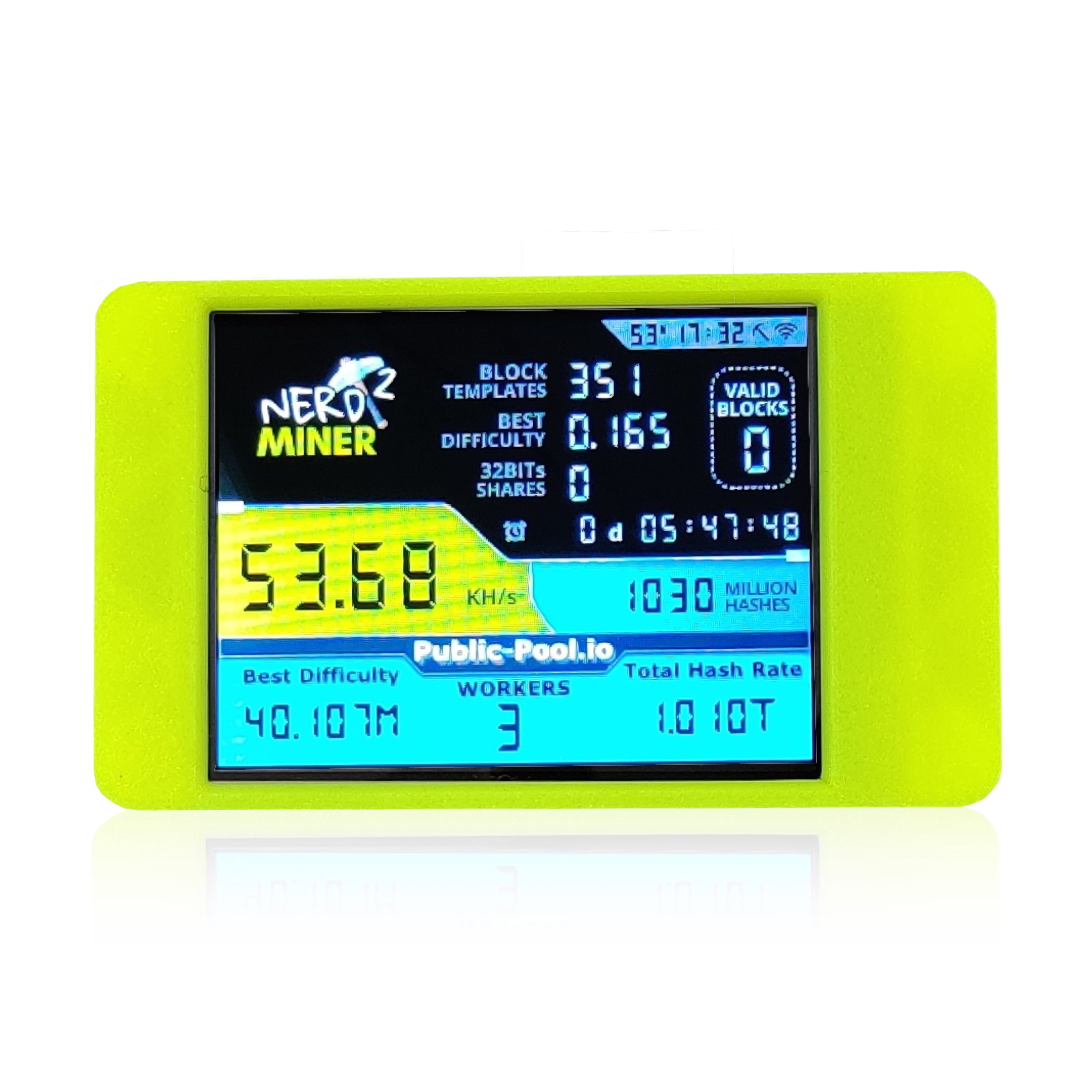 The NerdMiner is best suited to “solo” mining, as the hashrate wouldn’t be worth contributing to a pool. However, if you do manage to find a block you get to keep the entire block reward and transactions fees for yourself.